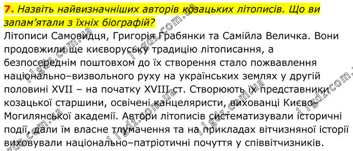 Назвіть найвизначніших авторів козацьких літописів. Що ви запам’ятали з їхніх біографій? Літописи Самовидця, Григорія Грабянки та Самійла Величка. Вони продовжили ще києворуську традицію літописання, а безпосереднім поштовхом до їх створення стало пожвавлення національно–визвольного руху на українських землях у другій половині XVII – на початку XVIII ст. Створюють їх представники козацької старшини, освічені канцеляристи, вихованці Києво–Могилянської академії. Автори літописів систематизували історичні події, дали їм власне тлумачення та на прикладах вітчизняної історії виховували національно–патріотичні почуття у співвітчизників.