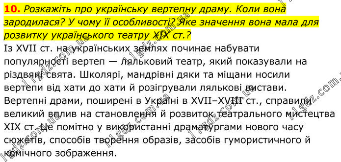 Розкажіть про українську вертепну драму. Коли вона зародилася? У чому її особливості? Яке значення вона мала для розвитку українського театру ХІХ ст.? Із XVII ст. на українських землях починає набувати популярності вертеп — ляльковий театр, який показували на різдвяні свята. Школярі, мандрівні дяки та міщани носили вертепи від хати до хати й розігрували лялькові вистави. Вертепні драми, поширені в Україні в XVII–XVIII ст., справили великий вплив на становлення й розвиток театрального мистецтва ХІХ ст. Це помітно у використанні драматургами нового часу сюжетів, способів творення образів, засобів гумористичного й комічного зображення.