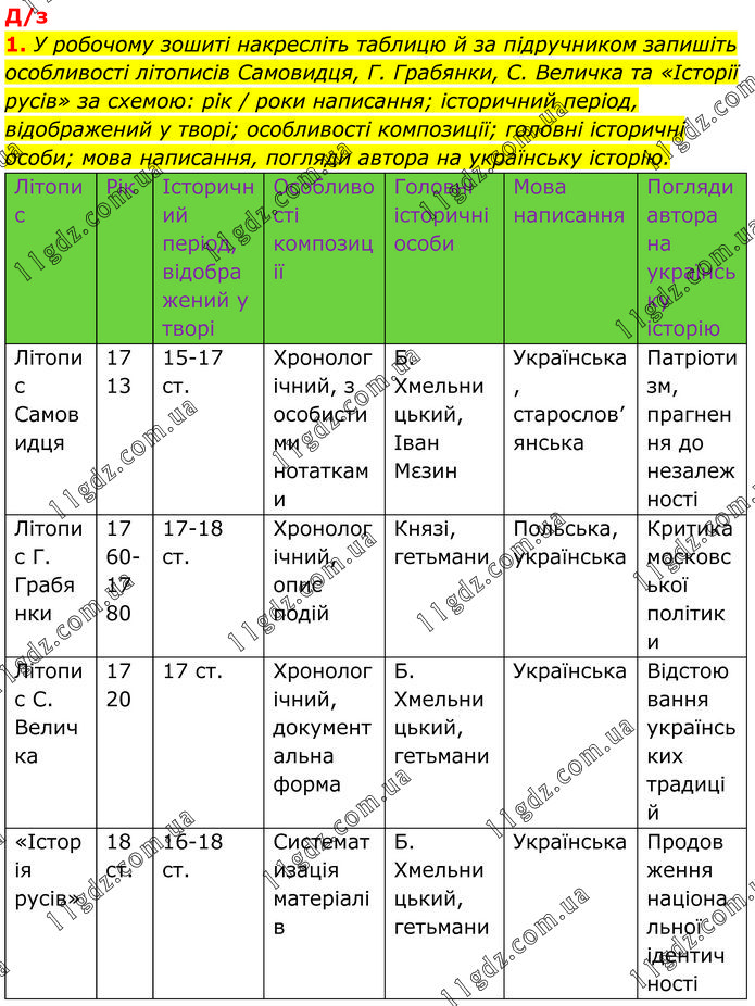 У робочому зошиті накресліть таблицю й за підручником запишіть особливості літописів Самовидця, Г. Грабянки, С. Величка та «Історії русів» за схемою: рік / роки написання; історичний період, відображений у творі; особливості композиції; головні історичні особи; мова написання, погляди автора на українську історію.