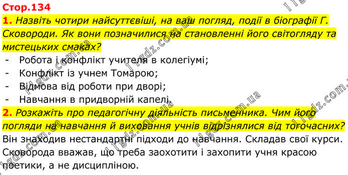 1. Назвіть чотири найсуттєвіші, на ваш погляд, події в біографії Г. Сковороди. Як вони позначилися на становленні його світогляду та мистецьких смаках? - Робота і конфлікт учителя в колегіумі; - Конфлікт із учнем Томарою; - Відмова від роботи при дворі; - Навчання в придворній капелі. 2. Розкажіть про педагогічну діяльність письменника. Чим його погляди на навчання й виховання учнів відрізнялися від тогочасних? Він знаходив нестандартні підходи до навчання. Складав свої курси. Сковорода вважав, що треба заохотити і захопити учня красою поетики, а не дисципліною.