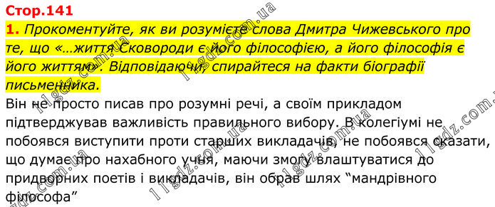 Прокоментуйте, як ви розумієте слова Дмитра Чижевського про те, що «…життя Сковороди є його філософією, а його філософія є його життям». Відповідаючи, спирайтеся на факти біографії письменника. Він не просто писав про розумні речі, а своїм прикладом підтверджував важливість правильного вибору. В колегіумі не побоявся виступити проти старших викладачів, не побоявся сказати, що думає про нахабного учня, маючи змогу влаштуватися до придворних поетів і викладачів, він обрав шлях “мандрівного філософа”.