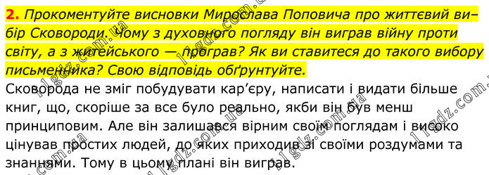 Прокоментуйте висновки Мирослава Поповича про життєвий вибір Сковороди. Чому з духовного погляду він виграв війну проти світу, а з житейського — програв? Як ви ставитеся до такого вибору письменника? Свою відповідь обґрунтуйте. Сковорода не зміг побудувати кар’єру, написати і видати більше книг, що, скоріше за все було реально, якби він був менш принциповим. Але він залишався вірним своїм поглядам і високо цінував простих людей, до яких приходив зі своїми роздумами та знаннями. Тому в цьому плані він виграв.