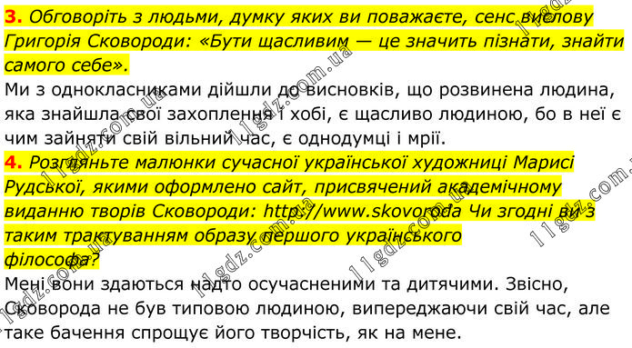 3. Обговоріть з людьми, думку яких ви поважаєте, сенс вислову Григорія Сковороди: «Бути щасливим — це значить пiзнати, знайти самого себе». Ми з однокласниками дійшли до висновків, що розвинена людина, яка знайшла свої захоплення і хобі, є щасливо людиною, бо в неї є чим зайняти свій вільний час, є однодумці і мрії. 4. Розгляньте малюнки сучасної української художниці Марисі Рудської, якими оформлено сайт, присвячений академічному виданню творів Сковороди: http://www.skovoroda Чи згодні ви з таким трактуванням образу першого українського філософа? Мені вони здаються надто осучасненими та дитячими. Звісно, Сковорода не був типовою людиною, випереджаючи свій час, але таке бачення спрощує його творчість, як на мене.