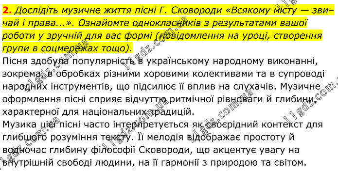 Дослідіть музичне життя пісні Г. Сковороди «Всякому місту — звичай і права...». Ознайомте однокласників з результатами вашої роботи у зручній для вас формі (повідомлення на уроці, створення групи в соцмережах тощо). Пісня здобула популярність в українському народному виконанні, зокрема, в обробках різними хоровими колективами та в супроводі народних інструментів, що підсилює її вплив на слухачів. Музичне оформлення пісні сприяє відчуттю ритмічної рівноваги й глибини, характерної для національних традицій. Музика цієї пісні часто інтерпретується як своєрідний контекст для глибшого розуміння тексту. Її мелодія відображає простоту й водночас глибину філософії Сковороди, що акцентує увагу на внутрішній свободі людини, на її гармонії з природою та світом.
