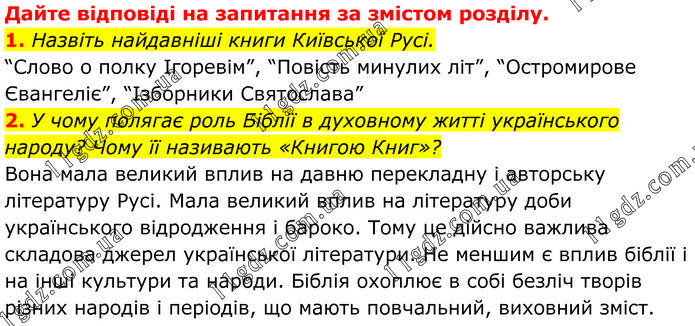 Дайте відповіді на запитання за змістом розділу. 1. Назвіть найдавніші книги Київської Русі. “Слово о полку Ігоревім”, “Повість минулих літ”, “Остромирове Євангеліє”, “Ізборники Святослава” 2. У чому полягає роль Біблії в духовному житті українського народу? Чому її називають «Книгою Книг»? Вона мала великий вплив на давню перекладну і авторську літературу Русі. Мала великий вплив на літературу доби українського відродження і бароко. Тому це дійсно важлива складова джерел української літератури. Не меншим є вплив біблії і на інші культури та народи. Біблія охоплює в собі безліч творів різних народів і періодів, що мають повчальний, виховний зміст.