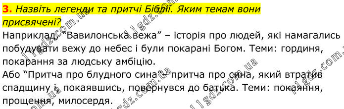 Назвіть легенди та притчі Біблії. Яким темам вони присвячені? Наприклад, “Вавилонська вежа” – історія про людей, які намагались побудувати вежу до небес і були покарані Богом. Теми: гординя, покарання за людську амбіцію. Або “Притча про блудного сина”– притча про сина, який втратив спадщину і, покаявшись, повернувся до батька. Теми: покаяння, прощення, милосердя.