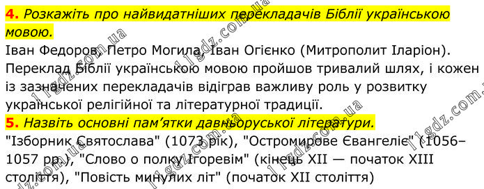4. Розкажіть про найвидатніших перекладачів Біблії українською мовою. Іван Федоров, Петро Могила, Іван Огієнко (Митрополит Іларіон). Переклад Біблії українською мовою пройшов тривалий шлях, і кожен із зазначених перекладачів відіграв важливу роль у розвитку української релігійної та літературної традиції. 5. Назвіть основні пам’ятки давньоруської літератури. "Ізборник Святослава" (1073 рік), "Остромирове Євангеліє" (1056–1057 рр.), "Слово о полку Ігоревім" (кінець XII — початок XIII століття), "Повість минулих літ" (початок XII століття)