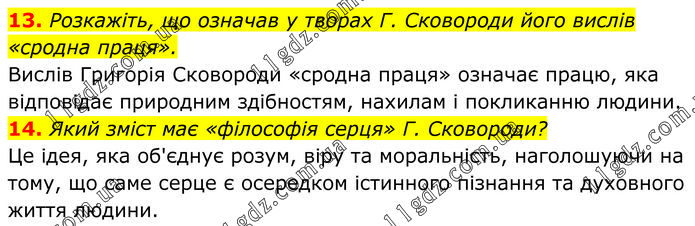 13. Розкажіть, що означав у творах Г. Сковороди його вислів «сродна праця». Вислів Григорія Сковороди «сродна праця» означає працю, яка відповідає природним здібностям, нахилам і покликанню людини. 14. Який зміст має «філософія серця» Г. Сковороди? Це ідея, яка об'єднує розум, віру та моральність, наголошуючи на тому, що саме серце є осередком істинного пізнання та духовного життя людини.