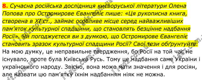 Сучасна російська дослідниця києворуської літератури Олена Попова про Остромирове Євангеліє пише: «Ця рукописна книга, створена в XI ст., займає особливе місце серед найважливіших пам’яток культурної спадщини, що становлять безцінне надбання Росії». Чи погоджуєтеся ви з думкою, що Остромирове Євангеліє становить зразок культурної спадщини Росії? Свої тези обґрунтуйте. На мою думку, це неправильне твердження, бо Росії на той час не існувало, проте була Київська Русь. Тому це надбання саме України і українського народу. Звісно, вона може мати значення і для росіян, але назвати цю пам’ятку їхнім надбанням ніяк не можна.