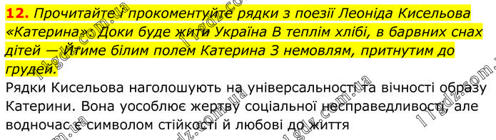 Прочитайте і прокоментуйте рядки з поезії Леоніда Кисельова «Катерина»: Доки буде жити Україна В теплім хлібі, в барвних снах дітей — Йтиме білим полем Катерина З немовлям, притнутим до грудей. Рядки Кисельова наголошують на універсальності та вічності образу Катерини. Вона уособлює жертву соціальної несправедливості, але водночас є символом стійкості й любові до життя.