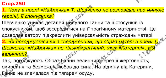 1. Чому в поемі «Наймичка» Т. Шевченко не розповідає про минуле героїні, її спокусника? Шевченко уникає деталей минулого Ганни та її стосунків із спокусником, щоб зосередитися на її трагічному материнстві. Це дозволяє автору підкреслити універсальність страждань матері. 2. Чи погоджуєтеся ви з твердженням, що образ матері в поемі Т. Шевченка «Наймичка» не тільки трагічний, як у «Катерині», а й величний? Так, погоджуюся. Образ Ганни величний через її жертовність, смирення та безмежну любов до сина. На відміну від Катерини, Ганна не зламалася під тягарем осуду.