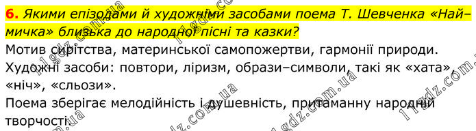 Якими епізодами й художніми засобами поема Т. Шевченка «Най– мичка» близька до народної пісні та казки? Мотив сирітства, материнської самопожертви, гармонії природи. Художні засоби: повтори, ліризм, образи–символи, такі як «хата», «ніч», «сльози». Поема зберігає мелодійність і душевність, притаманну народній творчості.