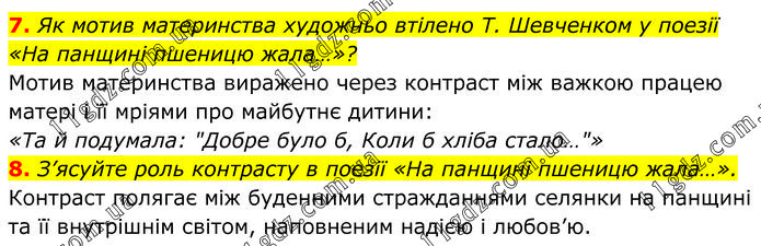 7. Як мотив материнства художньо втілено Т. Шевченком у поезії «На панщині пшеницю жала…»? Мотив материнства виражено через контраст між важкою працею матері і її мріями про майбутнє дитини: «Та й подумала: "Добре було б, Коли б хліба стало…"» 8. З’ясуйте роль контрасту в поезії «На панщині пшеницю жала…». Контраст полягає між буденними стражданнями селянки на панщині та її внутрішнім світом, наповненим надією і любов’ю.