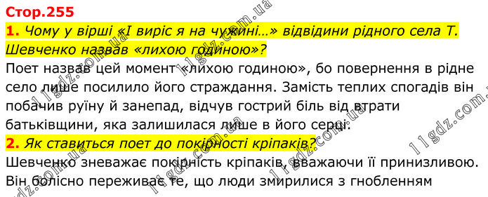 1. Чому у вірші «І виріс я на чужині…» відвідини рідного села Т. Шевченко назвав «лихою годиною»? Поет назвав цей момент «лихою годиною», бо повернення в рідне село лише посилило його страждання. Замість теплих спогадів він побачив руїну й занепад, відчув гострий біль від втрати батьківщини, яка залишилася лише в його серці. 2. Як ставиться поет до покірності кріпаків? Шевченко зневажає покірність кріпаків, вважаючи її принизливою. Він болісно переживає те, що люди змирилися з гнобленням.