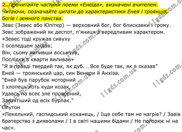 Прочитайте частини поеми «Енеїда», визначені вчителем. Читаючи, позначайте цитати до характеристики Енея і троянців, богів і земного панства. Зевс (Зевес або Юпітер) — верховний бог, бог блискавки і грому. Зевс зображений як деспот, п’яниця з вередливим характером. «Зевес тоді кружав сивуху І оселедцем заїдав; Він, сьому випивши восьмуху, Послідки з кварти виливав» “Я в правді твердий так, як дуб. …Все буде так, як я сказав” Еней — троянський цар, син Венери й Анхіза. “Еней був парубок моторний I хлопець хоть куди козак, Удавсь на всеє зле проворний, Завзятiший од всiх бурлак.” Плутон: «Пекельний, гаспидський коханець, / Іще себе там не нагрів? / Завів братерство з дияволами / І в світі нашими бідами / Не погорює ні на час».