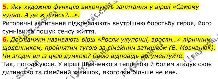 5. Яку художню функцію виконують запитання у вірші «Самому чудно. А де ж дітись?...». Риторичні запитання підкреслюють внутрішню боротьбу героя, його сумніви та пошук сенсу життя. 6. Дослідники називають вірш «Росли укупочці, зросли…» ліричним щоденником, пройнятим тугою за сімейним затишком (В. Мовчанюк). Чи згодні ви із цією думкою? Свою відповідь аргументуйте. Так, погоджуюся. У вірші Шевченко з теплотою й болем згадує своє дитинство та сімейний затишок, якого він більше не має.