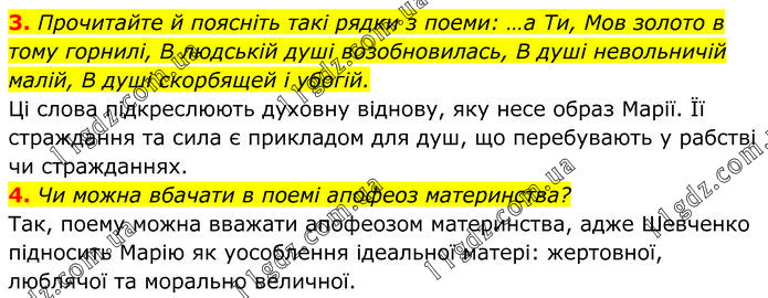 3. Прочитайте й поясніть такі рядки з поеми: …а Ти, Мов золото в тому горнилі, В людській душі возобновилась, В душі невольничій малій, В душі скорбящей і убогій. Ці слова підкреслюють духовну віднову, яку несе образ Марії. Її страждання та сила є прикладом для душ, що перебувають у рабстві чи стражданнях. 4. Чи можна вбачати в поемі апофеоз материнства? Так, поему можна вважати апофеозом материнства, адже Шевченко підносить Марію як уособлення ідеальної матері: жертовної, люблячої та морально величної.