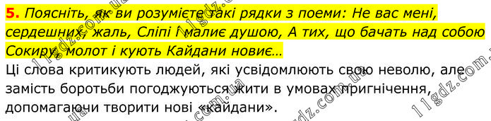 Поясніть, як ви розумієте такі рядки з поеми: Не вас мені, сердешних, жаль, Сліпі і малиє душою, А тих, що бачать над собою Сокиру, молот і кують Кайдани новиє… Ці слова критикують людей, які усвідомлюють свою неволю, але замість боротьби погоджуються жити в умовах пригнічення, допомагаючи творити нові «кайдани».