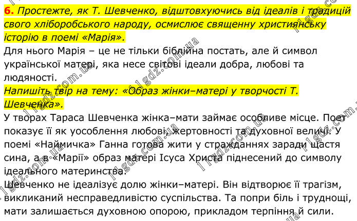Простежте, як Т. Шевченко, відштовхуючись від ідеалів і традицій свого хліборобського народу, осмислює священну християнську історію в поемі «Марія». Для нього Марія – це не тільки біблійна постать, але й символ української матері, яка несе світові ідеали добра, любові та людяності. Напишіть твір на тему: «Образ жінки–матері у творчості Т. Шевченка». У творах Тараса Шевченка жінка–мати займає особливе місце. Поет показує її як уособлення любові, жертовності та духовної величі. У поемі «Наймичка» Ганна готова жити у стражданнях заради щастя сина, а в «Марії» образ матері Ісуса Христа піднесений до символу ідеального материнства. Шевченко не ідеалізує долю жінки–матері. Він відтворює її трагізм, викликаний несправедливістю суспільства. Та попри біль і труднощі, мати залишається духовною опорою, прикладом терпіння й сили.