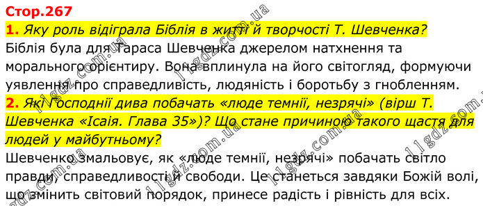 1. Яку роль відіграла Біблія в житті й творчості Т. Шевченка? Біблія була для Тараса Шевченка джерелом натхнення та морального орієнтиру. Вона вплинула на його світогляд, формуючи уявлення про справедливість, людяність і боротьбу з гнобленням. 2. Які Господнії дива побачать «люде темнії, незрячі» (вірш Т. Шевченка «Ісаія. Глава 35»)? Що стане причиною такого щастя для людей у майбутньому? Шевченко змальовує, як «люде темнії, незрячі» побачать світло правди, справедливості й свободи. Це станеться завдяки Божій волі, що змінить світовий порядок, принесе радість і рівність для всіх.