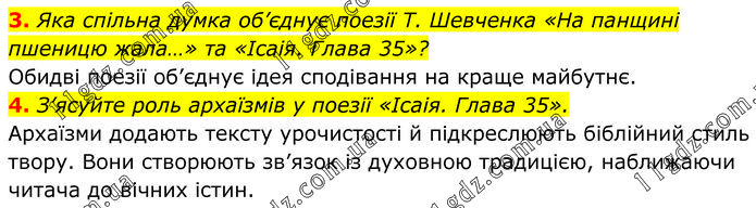 3. Яка спільна думка об’єднує поезії Т. Шевченка «На панщині пшеницю жала…» та «Ісаія. Глава 35»? Обидві поезії об’єднує ідея сподівання на краще майбутнє. 4. З’ясуйте роль архаїзмів у поезії «Ісаія. Глава 35». Архаїзми додають тексту урочистості й підкреслюють біблійний стиль твору. Вони створюють зв’язок із духовною традицією, наближаючи читача до вічних істин.