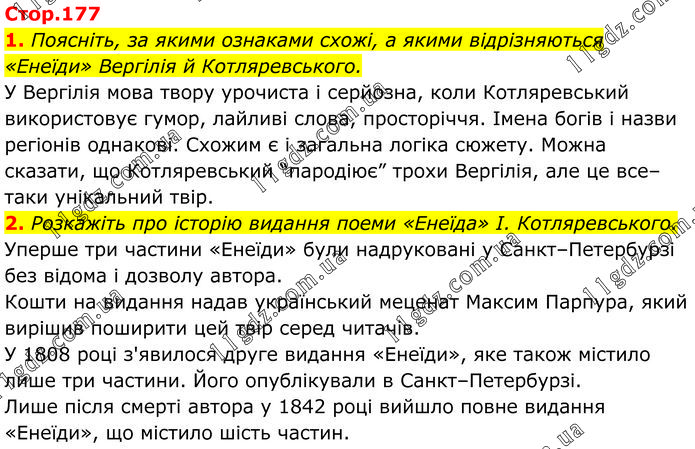 1. Поясніть, за якими ознаками схожі, а якими відрізняються «Енеїди» Вергілія й Котляревського. У Вергілія мова твору урочиста і серйозна, коли Котляревський використовує гумор, лайливі слова, просторіччя. Імена богів і назви регіонів однакові. Схожим є і загальна логіка сюжету. Можна сказати, що Котляревський “пародіює” трохи Вергілія, але це все–таки унікальний твір. 2. Розкажіть про історію видання поеми «Енеїда» І. Котляревського. Уперше три частини «Енеїди» були надруковані у Санкт–Петербурзі без відома і дозволу автора. Кошти на видання надав український меценат Максим Парпура, який вирішив поширити цей твір серед читачів. У 1808 році з'явилося друге видання «Енеїди», яке також містило лише три частини. Його опублікували в Санкт–Петербурзі. Лише після смерті автора у 1842 році вийшло повне видання «Енеїди», що містило шість частин.