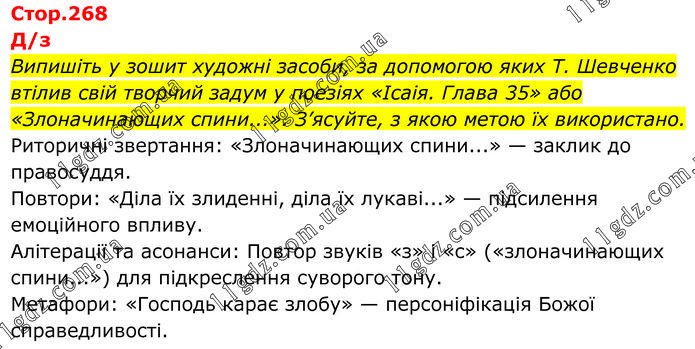 Випишіть у зошит художні засоби, за допомогою яких Т. Шевченко втілив свій творчий задум у поезіях «Ісаія. Глава 35» або «Злоначинающих спини...». З’ясуйте, з якою метою їх використано. Риторичні звертання: «Злоначинающих спини...» — заклик до правосуддя. Повтори: «Діла їх злиденні, діла їх лукаві...» — підсилення емоційного впливу. Алітерації та асонанси: Повтор звуків «з» і «с» («злоначинающих спини...») для підкреслення суворого тону. Метафори: «Господь карає злобу» — персоніфікація Божої справедливості.