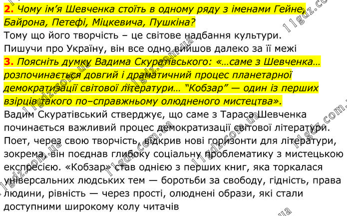 2. Чому ім’я Шевченка стоїть в одному ряду з іменами Гейне, Байрона, Петефі, Міцкевича, Пушкіна? Тому що його творчість – це світове надбання культури. Пишучи про Україну, він все одно вийшов далеко за її межі. 3. Поясніть думку Вадима Скуратівського: «…саме з Шевченка… розпочинається довгий і драматичний процес планетарної демократизації світової літератури… “Кобзар” — один із перших взірців такого по–справжньому олюдненого мистецтва». Вадим Скуратівський стверджує, що саме з Тараса Шевченка починається важливий процес демократизації світової літератури. Поет, через свою творчість, відкрив нові горизонти для літератури, зокрема, він поєднав глибоку соціальну проблематику з мистецькою експресією. «Кобзар» став однією з перших книг, яка торкалася універсальних людських тем — боротьби за свободу, гідність, права людини, рівність — через прості, олюднені образи, які стали доступними широкому колу читачів.