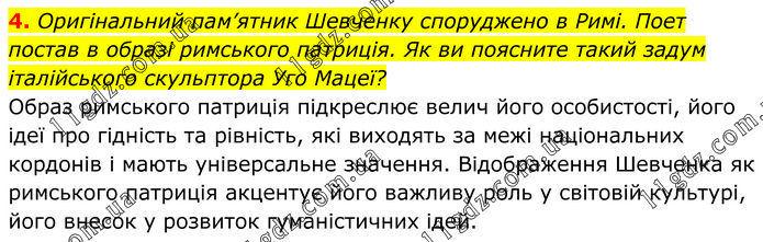 Оригінальний пам’ятник Шевченку споруджено в Римі. Поет постав в образі римського патриція. Як ви поясните такий задум італійського скульптора Уго Мацеї? Образ римського патриція підкреслює велич його особистості, його ідеї про гідність та рівність, які виходять за межі національних кордонів і мають універсальне значення. Відображення Шевченка як римського патриція акцентує його важливу роль у світовій культурі, його внесок у розвиток гуманістичних ідей.