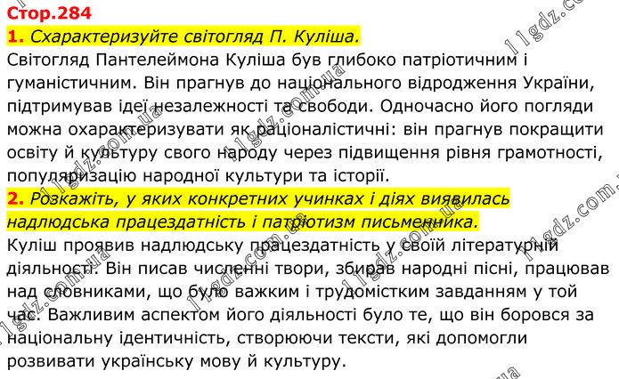1. Схарактеризуйте світогляд П. Куліша. Світогляд Пантелеймона Куліша був глибоко патріотичним і гуманістичним. Він прагнув до національного відродження України, підтримував ідеї незалежності та свободи. Одночасно його погляди можна охарактеризувати як раціоналістичні: він прагнув покращити освіту й культуру свого народу через підвищення рівня грамотності, популяризацію народної культури та історії. 2. Розкажіть, у яких конкретних учинках і діях виявилась надлюдська працездатність і патріотизм письменника. Куліш проявив надлюдську працездатність у своїй літературній діяльності. Він писав численні твори, збирав народні пісні, працював над словниками, що було важким і трудомістким завданням у той час. Важливим аспектом його діяльності було те, що він боровся за національну ідентичність, створюючи тексти, які допомогли розвивати українську мову й культуру.