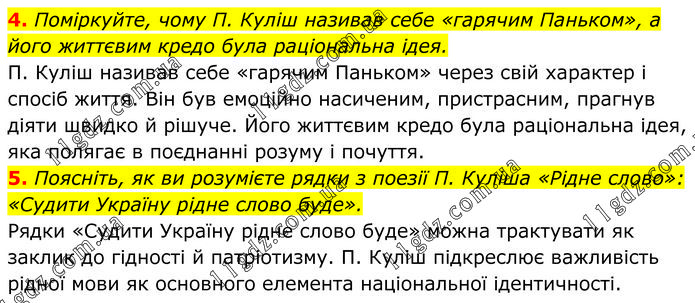 4. Поміркуйте, чому П. Куліш називав себе «гарячим Паньком», а його життєвим кредо була раціональна ідея. П. Куліш називав себе «гарячим Паньком» через свій характер і спосіб життя. Він був емоційно насиченим, пристрасним, прагнув діяти швидко й рішуче. Його життєвим кредо була раціональна ідея, яка полягає в поєднанні розуму і почуття. 5. Поясніть, як ви розумієте рядки з поезії П. Куліша «Рідне слово»: «Судити Україну рідне слово буде». Рядки «Судити Україну рідне слово буде» можна трактувати як заклик до гідності й патріотизму. П. Куліш підкреслює важливість рідної мови як основного елемента національної ідентичності.