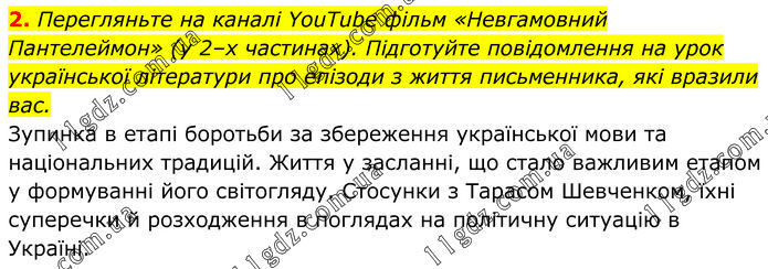Перегляньте на каналі YouTube фільм «Невгамовний Пантелеймон» (у 2–х частинах). Підготуйте повідомлення на урок української літератури про епізоди з життя письменника, які вразили вас. Зупинка в етапі боротьби за збереження української мови та національних традицій. Життя у засланні, що стало важливим етапом у формуванні його світогляду. Стосунки з Тарасом Шевченком, їхні суперечки й розходження в поглядах на політичну ситуацію в Україні.