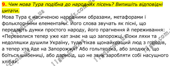 Чим мова Тура подібна до народних пісень? Випишіть відповідні цитати. Мова Тура є насиченою народними образами, метафорами і фольклорними елементами. Його слова звучать як пісні, що передають думки простого народу, його прагнення й переживання: «Перевелися тепер уже кат знає на що запорожці. Поки ляхи та недоляшки душили Україну, туди тікав щонайкращий люд з городів, а тепер хто йде на Запорожжя? Або гольтяпака, або злодюга, що боїться шибениці, або дармоїд, що не звик заробляти собі насущного хліба».