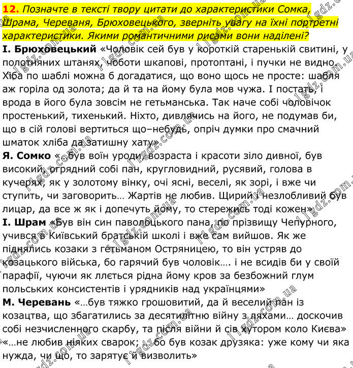 Позначте в тексті твору цитати до характеристики Сомка, Шрама, Череваня, Брюховецького, зверніть увагу на їхні портретні характеристики. Якими романтичними рисами вони наділені? І. Брюховецький «Чоловік сей був у короткій старенькій свитині, у полотняних штанях, чоботи шкапові, протоптані, і пучки не видно. Хіба по шаблі можна б догадатися, що воно щось не просте: шабля аж горіла од золота; да й та на йому була мов чужа. І постать, і врода в його була зовсім не гетьманська. Так наче собі чоловічок простенький, тихенький. Ніхто, дивлячись на його, не подумав би, що в сій голові вертиться що–небудь, опріч думки про смачний шматок хліба да затишну хату» Я. Сомко «…був воїн уроди, возраста і красоти зіло дивної, був високий, огрядний собі пан, кругловидний, русявий, голова в кучерях, як у золотому вінку, очі ясні, веселі, як зорі, і вже чи ступить, чи заговорить… Жартів не любив. Щирий і незлобливий був лицар, да все ж як і допечуть йому, то стережись тоді кожен» І. Шрам «Був він син паволоцького пана, по прізвищу Чепурного, учився в Київський братській школі і вже сам вийшов. Як же піднялись козаки з гетьманом Остряницею, то він устряв до козацького війська, бо гарячий був чоловік…. і не всидів би у своїй парафії, чуючи як ллється рідна йому кров за безбожний глум польських консистентів і урядників над українцями» М. Черевань «…був тяжко грошовитий, да й веселий пан із козацтва, що збагатились за десятилітню війну з ляхами… доскочив собі незчисленного скарбу, та після війни й сів хутором коло Києва» «…не любив ніяких сварок; … бо був козак друзяка: уже кому чи яка нужда, чи що, то зарятує й визволить»