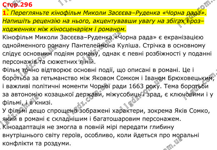 Перегляньте кінофільм Миколи Засєєва–Руденка «Чорна рада». Напишіть рецензію на нього, акцентувавши увагу на збігах і роз– ходженнях між кіносценарієм і романом. Кінофільм Миколи Засєєва–Руденка «Чорна рада» є екранізацією однойменного роману Пантелеймона Куліша. Стрічка в основному слідує основним подіям роману, однак є певні розбіжності у поданні персонажів та сюжетних ліній. Фільм точно відтворює основні події, що описані в романі. Це і боротьба за гетьманство між Яковом Сомком і Іваном Брюховецьким, і важливі політичні моменти Чорної ради 1663 року. Тема боротьби за автономію козацької держави, міжусобиць і зрад, є ключовими і у фільмі, і в книзі. У фільмі дещо спрощено зображені характери, зокрема Яків Сомко, який в романі є складнішим і багатошаровим персонажем. Кіноадаптація не змогла в повній мірі передати глибину внутрішнього світу героїв, особливо, коли йдеться про моральні конфлікти та роздуми.