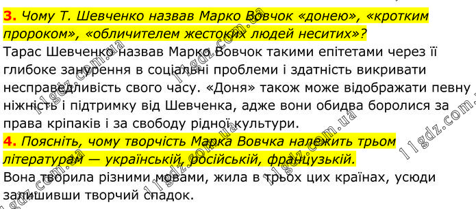 3. Чому Т. Шевченко назвав Марко Вовчок «донею», «кротким пророком», «обличителем жестоких людей неситих»? Тарас Шевченко назвав Марко Вовчок такими епітетами через її глибоке занурення в соціальні проблеми і здатність викривати несправедливість свого часу. «Доня» також може відображати певну ніжність і підтримку від Шевченка, адже вони обидва боролися за права кріпаків і за свободу рідної культури. 4. Поясніть, чому творчість Марка Вовчка належить трьом літературам — українській, російській, французькій. Вона творила різними мовами, жила в трьох цих країнах, усюди залишивши творчий спадок.