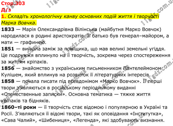 Складіть хронологічну канву основних подій життя і творчості Марка Вовчка. 1833 — Марія Олександрівна Вілінська (майбутня Марко Вовчок) народилася в родині аристократів. Її батько був генерал–майором, а мати — графинею. 1851 — вийшла заміж за поміщика, що мав великі земельні угіддя. Це подружжя вплинуло на її творчість, зокрема через спостереження за життям кріпаків. 1856 — знайомство з українським письменником Пантелеймоном Кулішем, який вплинув на розвиток її літературних інтересів. 1858 — почала писати під псевдонімом «Марко Вовчок». Її перші твори з’являються в російському періодичному виданні «Отечественные записки». Основна тематика — тяжке життя кріпаків та бідняків. 1860–ті роки — її творчість стає відомою і популярною в Україні та Росії. З’являються її відомі твори, такі як оповідання «Інститутка», «Сава Чалий», «Шибениця», «Легенда», які здобувають визнання.