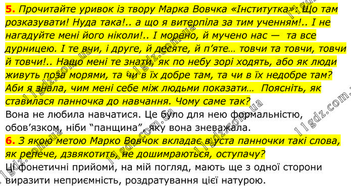 5. Прочитайте уривок із твору Марка Вовчка «Інститутка»: Що там розказувати! Нуда така!.. а що я витерпіла за тим ученням!.. І не нагадуйте мені його ніколи!.. І морено, й мучено нас — та все дурницею. І те вчи, і друге, й десяте, й п’яте… товчи та товчи, товчи й товчи!.. Нащо мені те знати, як по небу зорі ходять, або як люди живуть поза морями, та чи в їх добре там, та чи в їх недобре там? Аби я знала, чим мені себе між людьми показати… Поясніть, як ставилася панночка до навчання. Чому саме так? Вона не любила навчатися. Це було для нею формальністю, обов’язком, ніби “панщина”, яку вона зневажала. 6. З якою метою Марко Вовчок вкладає в уста панночки такі слова, як репече, дзвякотить, не дошимраються, оступачу? Ці фонетичні прийоми, на мій погляд, мають ще з одної сторони виразити неприємність, роздратування цієї натурою.