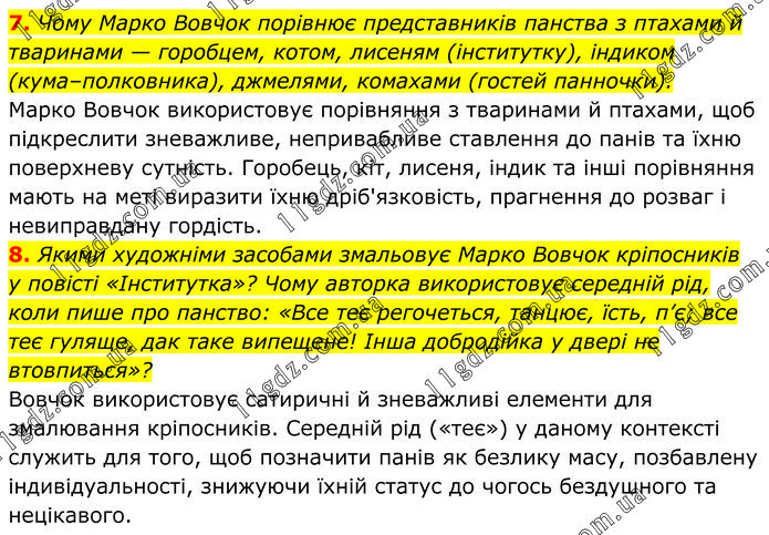 7. Чому Марко Вовчок порівнює представників панства з птахами й тваринами — горобцем, котом, лисеням (інститутку), індиком (кума–полковника), джмелями, комахами (гостей панночки). Марко Вовчок використовує порівняння з тваринами й птахами, щоб підкреслити зневажливе, непривабливе ставлення до панів та їхню поверхневу сутність. Горобець, кіт, лисеня, індик та інші порівняння мають на меті виразити їхню дріб'язковість, прагнення до розваг і невиправдану гордість. 8. Якими художніми засобами змальовує Марко Вовчок кріпосників у повісті «Інститутка»? Чому авторка використовує середній рід, коли пише про панство: «Все теє регочеться, танцює, їсть, п’є; все теє гуляще, дак таке випещене! Інша добродійка у двері не втовпиться»? Вовчок використовує сатиричні й зневажливі елементи для змалювання кріпосників. Середній рід («теє») у даному контексті служить для того, щоб позначити панів як безлику масу, позбавлену індивідуальності, знижуючи їхній статус до чогось бездушного та нецікавого.