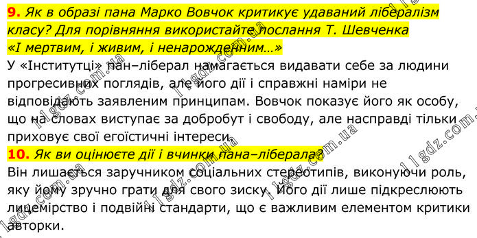 9. Як в образі пана Марко Вовчок критикує удаваний лібералізм класу? Для порівняння використайте послання Т. Шевченка «І мертвим, і живим, і ненарожденним…» У «Інститутці» пан–ліберал намагається видавати себе за людини прогресивних поглядів, але його дії і справжні наміри не відповідають заявленим принципам. Вовчок показує його як особу, що на словах виступає за добробут і свободу, але насправді тільки приховує свої егоїстичні інтереси. 10. Як ви оцінюєте дії і вчинки пана–ліберала? Він лишається заручником соціальних стереотипів, виконуючи роль, яку йому зручно грати для свого зиску. Його дії лише підкреслюють лицемірство і подвійні стандарти, що є важливим елементом критики авторки.