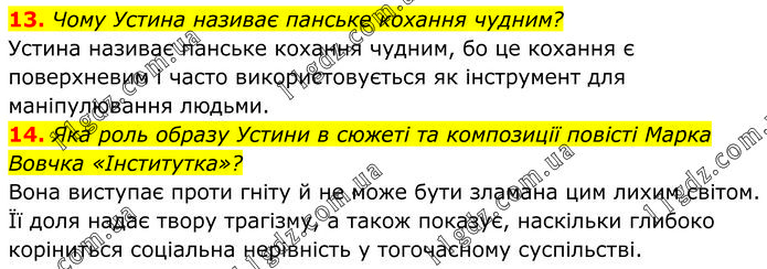 13. Чому Устина називає панське кохання чудним? Устина називає панське кохання чудним, бо це кохання є поверхневим і часто використовується як інструмент для маніпулювання людьми. 14. Яка роль образу Устини в сюжеті та композиції повісті Марка Вовчка «Інститутка»? Вона виступає проти гніту й не може бути зламана цим лихим світом. Її доля надає твору трагізму, а також показує, наскільки глибоко коріниться соціальна нерівність у тогочасному суспільстві.