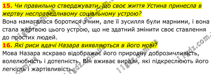 15. Чи правильно стверджувати, що своє життя Устина принесла в жертву несправедливому соціальному устрою? Вона намагалася боротися з ним, але її зусилля були марними, і вона стала жертвою цього устрою, що не здатний змінити своє ставлення до простих людей. 16. Які риси вдачі Назара виявляються в його мові? Мова Назара яскраво відображає його природну доброзичливість, волелюбність і дотепність. Він вживає вирази, які підкреслюють його легкість і жартівливість.
