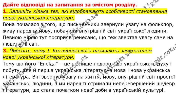 Дайте відповіді на запитання за змістом розділу. 1. Запишіть кілька тез, які відображають особливості становлення нової української літератури. Вона почалася з того, що письменники звернули увагу на фольклор, живу народну мову, побачили внутрішній світ української людини. Певною мірою тут посприяв ренесанс, що теж звертав увагу саме на людину, її світ. 3. Поясніть, чому І. Котляревського називають зачинателем нової української літератури. Тому що його “Енеїда” – це не лише подорож до українського духу і побуту, але й перша українська літературна мова і нова українська література. Він звернув увагу на життя, мову, внутрішній світ простої української людини, а ми нарешті отримали неперевершений шедевр літератури, що стала початком нової доби в українській культурі.