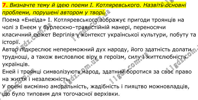 Визначте тему й ідею поеми І. Котляревського. Назвіть основні проблеми, порушені автором у творі. Поема «Енеїда» І. Котляревського зображує пригоди троянців на чолі з Енеєм у бурлескно–травестійній манері, переносячи класичний сюжет Вергілія у контекст української культури, побуту та історії. Автор підкреслює непереможний дух народу, його здатність долати труднощі, а також висловлює віру в героїзм, силу і життєлюбність українців. Еней і троянці символізують народ, здатний боротися за своє право на життя і незалежність. У поемі висміяно аморальність, жадібність і пияцтво можновладців, що було типовим для тогочасної верхівки.