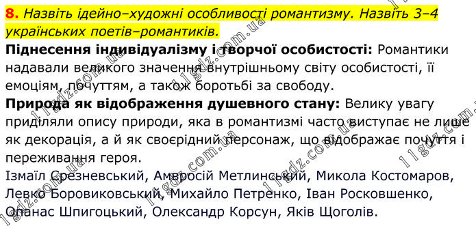 Назвіть ідейно–художні особливості романтизму. Назвіть 3–4 українських поетів–романтиків. Піднесення індивідуалізму і творчої особистості: Романтики надавали великого значення внутрішньому світу особистості, її емоціям, почуттям, а також боротьбі за свободу. Природа як відображення душевного стану: Велику увагу приділяли опису природи, яка в романтизмі часто виступає не лише як декорація, а й як своєрідний персонаж, що відображає почуття і переживання героя. Ізмаїл Срезневський, Амвросій Метлинський, Микола Костомаров, Левко Боровиковський, Михайло Петренко, Іван Росковшенко, Опанас Шпигоцький, Олександр Корсун, Яків Щоголів.