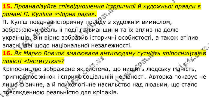 15. Проаналізуйте співвідношення історичної й художньої правди в романі П. Куліша «Чорна рада». П. Куліш поєднав історичну правду з художнім вимислом, зображаючи реальні події гетьманщини та їх вплив на долю українців. Він вірно зобразив історичні особистості, а також втілив власні ідеї щодо національної незалежності. 16. Як Марко Вовчок змалювала антилюдяну сутність кріпосництва в повісті «Інститутка»? Кріпосництво зображене як система, що нищить людську гідність, пригноблює жінок і сприяє соціальній нерівності. Авторка показує не лише фізичне, а й психологічне насильство над людьми, що стало повсякденною реальністю для кріпаків.