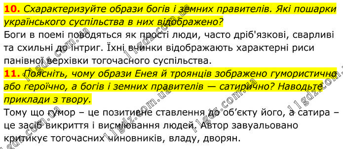 10. Схарактеризуйте образи богів і земних правителів. Які пошарки українського суспільства в них відображено? Боги в поемі поводяться як прості люди, часто дріб'язкові, сварливі та схильні до інтриг. Їхні вчинки відображають характерні риси панівної верхівки тогочасного суспільства. 11. Поясніть, чому образи Енея й троянців зображено гумористично або героїчно, а богів і земних правителів — сатирично? Наводьте приклади з твору. Тому що гумор – це позитивне ставлення до об’єкту його, а сатира – це засіб викриття і висміювання людей. Автор завуальовано критикує тогочасних чиновників, владу, дворян.