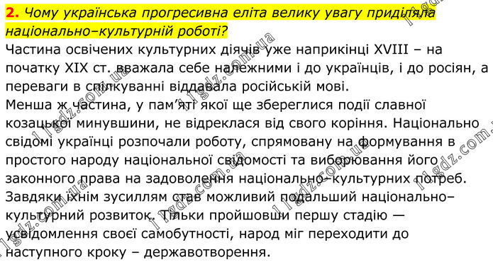 Чому українська прогресивна еліта велику увагу приділяла національно–культурній роботі? Частина освічених культурних діячів уже наприкінці XVIII – на початку ХІХ ст. вважала себе належними і до українців, і до росіян, а переваги в спілкуванні віддавала російській мові. Менша ж частина, у пам’яті якої ще збереглися події славної козацької минувшини, не відреклася від свого коріння. Національно свідомі українці розпочали роботу, спрямовану на формування в простого народу національної свідомості та виборювання його законного права на задоволення національно–культурних потреб. Завдяки їхнім зусиллям став можливий подальший національно– культурний розвиток. Тільки пройшовши першу стадію — усвідомлення своєї самобутності, народ міг переходити до наступного кроку – державотворення.