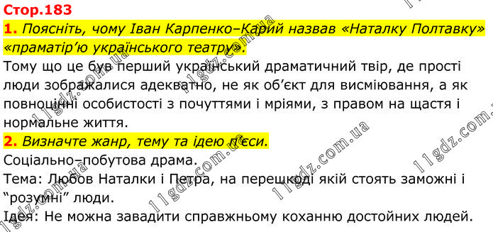 1. Поясніть, чому Іван Карпенко–Карий назвав «Наталку Полтавку» «праматір’ю українського театру». Тому що це був перший український драматичний твір, де прості люди зображалися адекватно, не як об’єкт для висміювання, а як повноцінні особистості з почуттями і мріями, з правом на щастя і нормальне життя. 2. Визначте жанр, тему та ідею п’єси. Соціально–побутова драма. Тема: Любов Наталки і Петра, на перешкоді якій стоять заможні і “розумні” люди. Ідея: Не можна завадити справжньому коханню достойних людей.