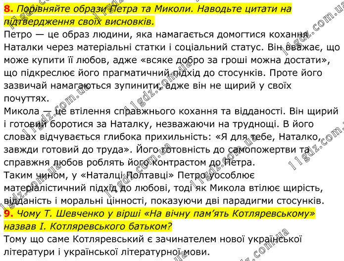 8. Порівняйте образи Петра та Миколи. Наводьте цитати на підтвердження своїх висновків. Петро — це образ людини, яка намагається домогтися кохання Наталки через матеріальні статки і соціальний статус. Він вважає, що може купити її любов, адже «всяке добро за гроші можна достати», що підкреслює його прагматичний підхід до стосунків. Проте його зазвичай намагаються зупинити, адже він не щирий у своїх почуттях. Микола — це втілення справжнього кохання та відданості. Він щирий і готовий боротися за Наталку, незважаючи на труднощі. В його словах відчувається глибока прихильність: «Я для тебе, Наталко, завжди готовий до труда». Його готовність до самопожертви та справжня любов роблять його контрастом до Петра. Таким чином, у «Наталці Полтавці» Петро уособлює матеріалістичний підхід до любові, тоді як Микола втілює щирість, відданість і моральні цінності, показуючи дві парадигми стосунків. 9. Чому Т. Шевченко у вірші «На вічну пам’ять Котляревському» назвав І. Котляревського батьком? Тому що саме Котляревський є зачинателем нової української літератури і української літературної мови.
